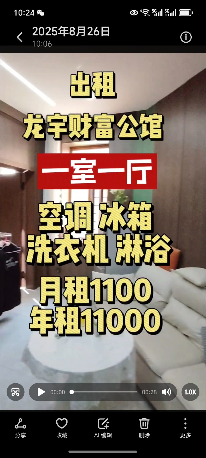低價(jià)急租 月租900 出租二道街龍宇財(cái)富公館,60平米,一室一廳,電梯,精裝修,空調(diào) 冰箱 洗衣機(jī) 熱水器,雙床,拎包入住,月租900。