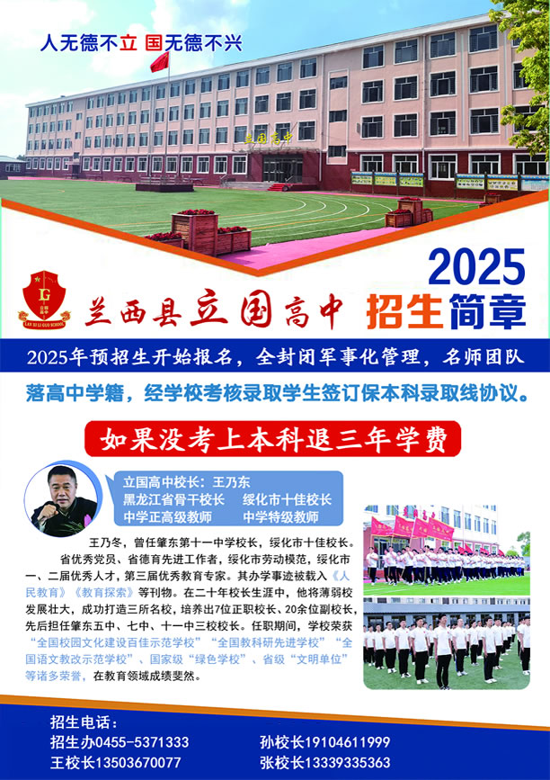 蘭西縣立國藝術(shù)中學(xué),一校區(qū)位于蘭西縣福和城6號樓附近(二校區(qū)待建中),校園占地面積7000平方米。其中綠化面積400平方米,運動場地面積3785平方米。建筑面積3652平方米,其中教學(xué)樓3400平方米,警務(wù)室、倉庫(板房)等260平方米。功能室、教育教學(xué)設(shè)施齊全,共有領(lǐng)導(dǎo)辦公室6個。功能室16個(包括音、體、美器材室;音、體、美教室;理、化、生實驗室3個及理、化、生實驗準備室儀器室3個、健康體檢室、閱覽室(2個)、圖書室、檔案室、微機室和多功能報告廳)。教學(xué)樓還內(nèi)設(shè)財務(wù)室、主控室、儲藏室、衛(wèi)生間。