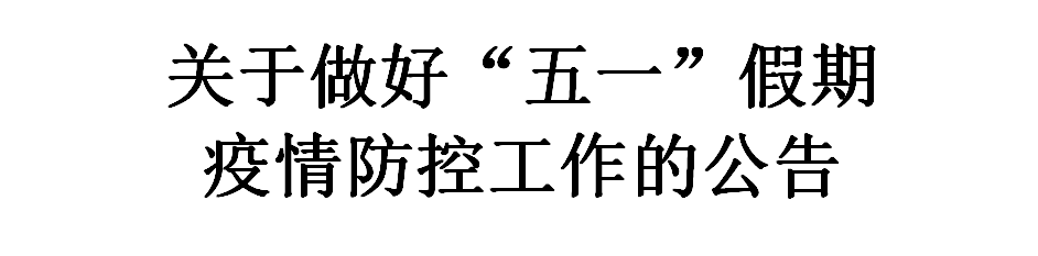 為切實做好“五一”期間新冠肺炎疫情防控工作,認真落實好“外防輸入、內防反彈”嚴十條要求,切實保障人民群眾身體健康,現(xiàn)將有關事宜公告如下。