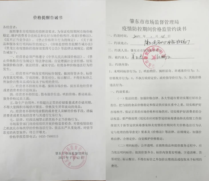 同時,對全市9個大中型超市負責(zé)人進行約談,并在《價格監(jiān)管約談書》上簽字。各基層分局監(jiān)管人員分別深入轄區(qū)經(jīng)營商戶,發(fā)放《價格提醒告誡書》2200余份,宣傳疫情防控知識和價格管理相關(guān)的法律法規(guī),要求各市場主體遵紀守法,自覺維護市場秩序,為全市抗擊疫情貢獻自身力量。