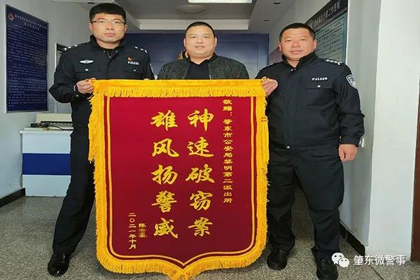 10月15日,肇東市黎明鎮(zhèn)民富村某裝飾材料加工廠負(fù)責(zé)人陳某到肇東市公安局黎明第二派出所,將一面印有“神速破竊案  雄風(fēng)揚(yáng)警威”的錦旗贈(zèng)送給派出所民警,對(duì)派出所在短時(shí)期內(nèi)破獲其廠內(nèi)工人財(cái)物被盜案表示感謝。