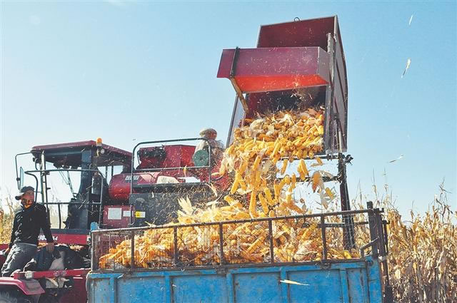 黑龍江日?qǐng)?bào)10月25日訊 金秋十月,收獲旺季,肇東市田間地頭一片繁忙景象。在海城鎮(zhèn)長(zhǎng)井村任家屯,八九臺(tái)收割機(jī)在金黃的玉米田里縱橫穿梭,緊鑼密鼓收獲著3000畝玉米。