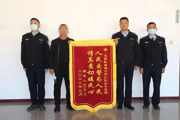 9月中旬,肇東市七道街利民城附近人行道違停三輛翻斗車(chē)嚴(yán)重影響行人通行,造成一周姓老年人因躲避車(chē)輛而摔倒,如果不及時(shí)處理可能造成其它嚴(yán)重后果。城鎮(zhèn)三中隊(duì)得知情況后立即趕到現(xiàn)場(chǎng),根據(jù)具體情況將三輛車(chē)托運(yùn)至停車(chē)場(chǎng),消除了安全隱患,得到周邊群眾一片叫好聲。9月25日,被摔倒老人的兒子為感謝交警,送來(lái)一面寫(xiě)有“人民交警為人民 情真意切暖民心”的錦旗表示感謝!