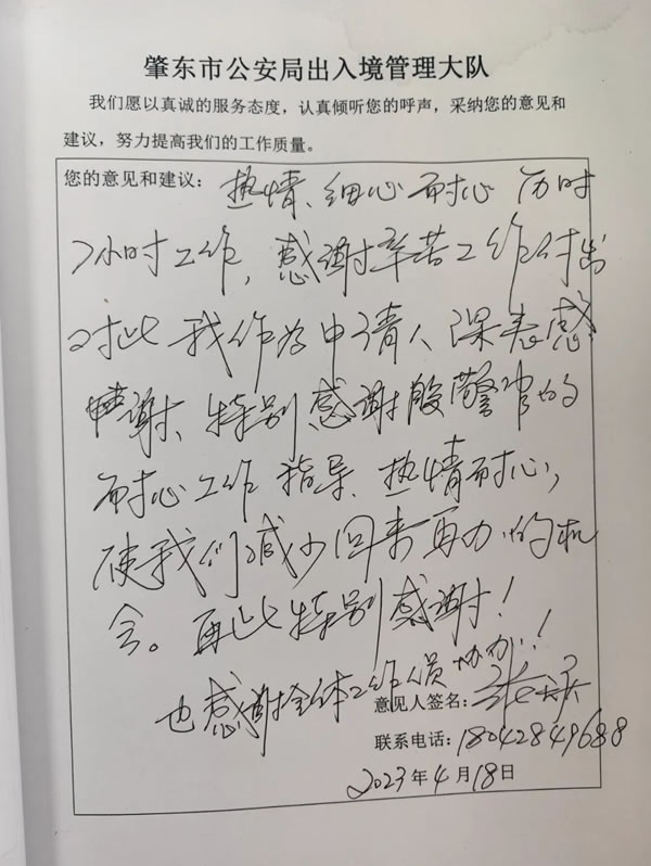 4月18日,從香港返鄉(xiāng)的肇東籍居民張先生攜妻子陳女士來到肇東市公安局出入境接待大廳,妻子陳女士是香港人,兩人此次是專程飛回來辦理張先生赴香港定居手續(xù),為了不耽誤二人的返程時(shí)間,辦證民警加班加點(diǎn)忙碌兩個(gè)多小時(shí)為張先生辦理通過所需辦證材料,張先生感動不已,連連說:“家鄉(xiāng)人太好了,你們出入境民警太暖心了!”當(dāng)即寫下一封感謝信表達(dá)心情。