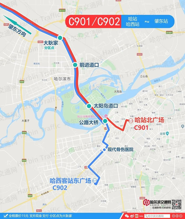 肇東至哈市城際公交分為兩條線路。其中,C901路始至哈站,C902路始至哈西站。主要站點(diǎn)途經(jīng)“肇東火車(chē)站”、“三道街”站、“大耿家”站、“前進(jìn)道口”站、“太陽(yáng)島道口”站、“公路大橋”站、“哈站北廣場(chǎng)公交首末站”、“哈西客站東廣場(chǎng)”站。