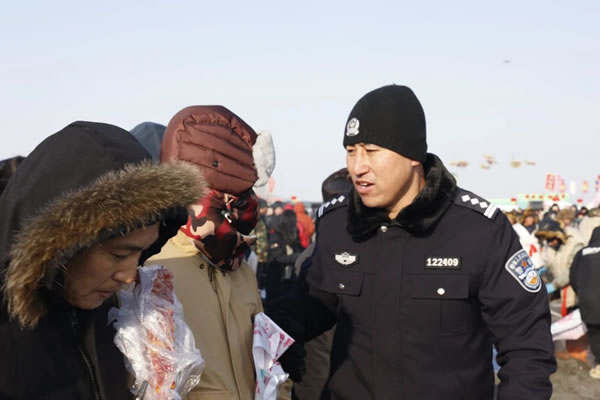 由于捕魚時(shí)湖面上打下了很多“冰眼”,為了防止群眾距離出魚口過近掉入“冰眼”,執(zhí)勤民警合力將“冰眼”守護(hù)起來,疏導(dǎo)圍觀群眾保持安全距離。執(zhí)勤過程中,民警們不畏嚴(yán)寒、頑強(qiáng)作戰(zhàn),組織、疏導(dǎo)現(xiàn)場群眾有序觀看捕魚,有效防止了意外事故的發(fā)生。