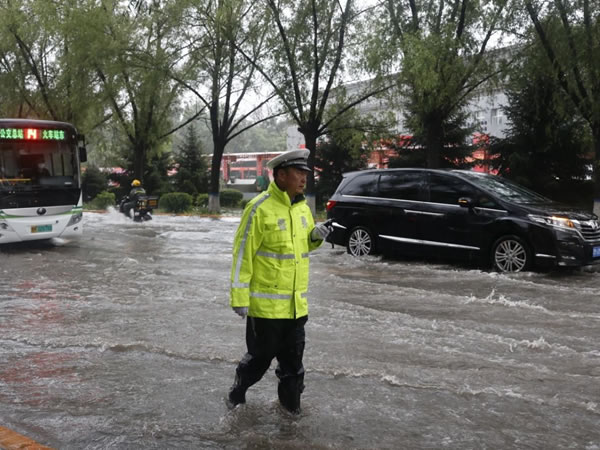7月31日下午,肇東市普降大到暴雨,城區(qū)部分低洼地帶積水嚴重,道路濕滑、視線模糊,車輛行人出行受阻,給交通出行帶來了極大不便!坝昵榫褪蔷椋瑫惩ň褪秦熑巍。面對這種突發(fā)情況,肇東公安交警以雨為令,聞雨而動,在轄區(qū)各主要路段安排警力,主動出擊,雨中堅守,筑起事故預(yù)防“防護墻”。