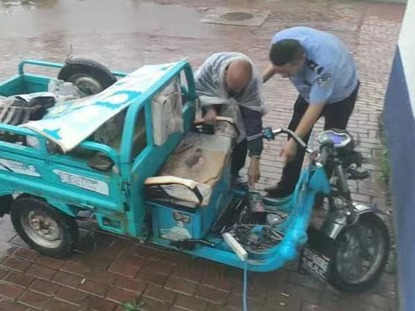 民警發(fā)現(xiàn)求助的是一位殘疾人,車是一輛電動(dòng)三輪車?吹矫窬螅瑘(bào)警的群眾略顯緊張,將事情經(jīng)過小聲地講給民警等人聽。原來,這位群眾姓遲,受過外傷導(dǎo)致殘疾,平時(shí)靠一輛電動(dòng)小三輪出行。今天早上,遲大哥從澇洲鎮(zhèn)到肇東市區(qū)來溜達(dá),順便想吃點(diǎn)肇東小餅,沒想到趕上下了一天的雨,想回去澇州時(shí)電動(dòng)車就沒電“罷工”了,F(xiàn)在離家里還有好幾十公里路,沒有地方充電了,所以想到這個(gè)時(shí)候只有人民警察能幫助自己,遲大哥看見巡邏警察趕緊向警察求助。