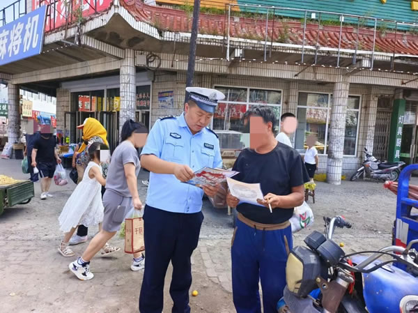 在昌五鎮(zhèn)中心商業(yè)區(qū),這里聚集了周邊鄉(xiāng)鎮(zhèn)眾多村屯群眾在此購物、游玩,人流、車流不息。宣傳民警深入到集市、商場等人員密集區(qū)域,結(jié)合當(dāng)前交通安全宣傳工作重點(diǎn)活動實際,通過大篷車巡回宣講、懸掛宣傳條幅、發(fā)放交通安全宣傳資料等多種宣傳方式,與群眾面對面溝通,、解答群眾關(guān)于交通法律法規(guī)方面的疑問,向廣大農(nóng)民群眾宣傳“一盔一帶”的重要性和農(nóng)用車違法載人、客貨混載、三超一疲勞、無牌無證、酒后駕駛等交通違法行為的危害性。宣傳講解《黑龍江省電動車管理條例》相關(guān)內(nèi)容,教育引導(dǎo)農(nóng)民群眾要遵守交通安全法律法規(guī),提高交通安全意識,自覺抵制各類交通違法行為。爭做文明出行的踐行人和傳播者。