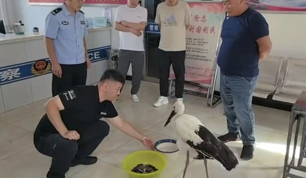 8月28日,躍進(jìn)鄉(xiāng)福龍村書記宋健來(lái)到肇東市公安局躍進(jìn)派出所,稱在躍進(jìn)鄉(xiāng)福龍村新發(fā)屯草甸子上發(fā)現(xiàn)一只大鳥晃晃蕩蕩落在草甸子上,不斷哀鳴。大鳥體長(zhǎng)120厘米左右,身上大部分呈白色,翅膀下方呈黑色,嘴部呈黑色,嘴的基部較厚,往尖端逐漸變細(xì),并且略微向上翹,前頸的下部有呈披針形的長(zhǎng)羽,腿部較長(zhǎng)。但他一下子想不起來(lái)鳥的名字,只是知道它應(yīng)該是保護(hù)動(dòng)物,因此請(qǐng)求派出所進(jìn)行救助。宋健介紹不知為什么,發(fā)現(xiàn)時(shí)這只大鳥不飛、不動(dòng),行動(dòng)遲緩,也不曾進(jìn)食,走上前也不怕,站在原地,他趕緊將它抱到派出所。民警看到大鳥后宛如“仙鶴”下凡,優(yōu)美的體態(tài),潔白的羽毛,朱紅色的眼眶,寬而長(zhǎng)的翅膀,一看就是不尋常的鳥,民警擔(dān)心它有傷或是生病了,立即聯(lián)系肇東市林業(yè)部門,尋求專業(yè)的指導(dǎo);經(jīng)專家仔細(xì)辨認(rèn),這只鳥類并不是“仙鶴”,而是被譽(yù)為“鳥中大熊貓”的東方白鸛,是國(guó)家一級(jí)保護(hù)動(dòng)物。經(jīng)初步檢查,其外表沒(méi)有明顯傷痕,右側(cè)翅膀受點(diǎn)輕傷耷拉下來(lái),但整體狀態(tài)較為虛弱,民警在派出所設(shè)置臨時(shí)保護(hù)區(qū)域,確保動(dòng)物的安全,避免其受到二次傷害,民警拿來(lái)小魚和水進(jìn)行投喂,白鸛簡(jiǎn)單吃了幾只小魚。隨后民警對(duì)村書記的救助行為表示感謝。