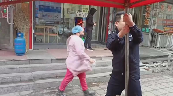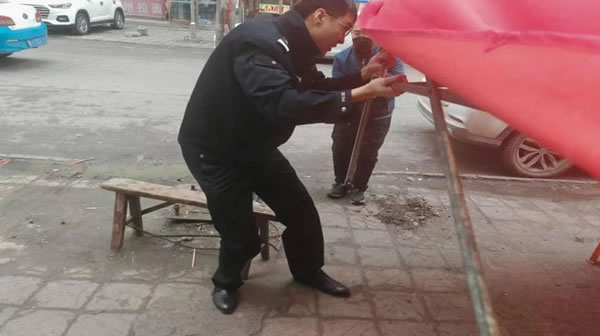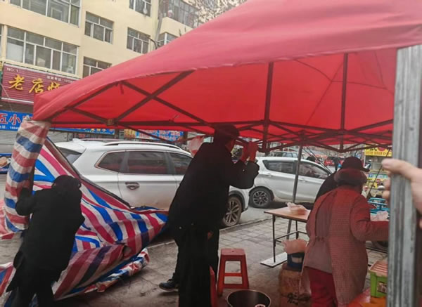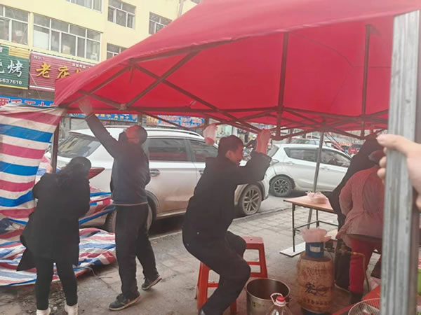 上午,副所長吳復(fù)生帶領(lǐng)輔警崔曉亮巡邏至花園街一商鋪門口時(shí),發(fā)現(xiàn)其門口用于遮擋其制作油條臺子的簡易帳篷在大風(fēng)中劇烈搖晃。此時(shí)老板正在帳篷內(nèi)忙碌制作油條,周圍行人不斷,帳篷一旦被大風(fēng)掀翻,后果不堪設(shè)想。見此危急情況,吳復(fù)生和崔曉亮立即快步上前。他們先安撫緊張的老板,讓其不要慌亂,隨后兩人齊心協(xié)力,在狂風(fēng)中艱難地將帳篷收起。盡管大風(fēng)呼呼作響,吹得他們站立不穩(wěn),但二人始終沒有放棄。