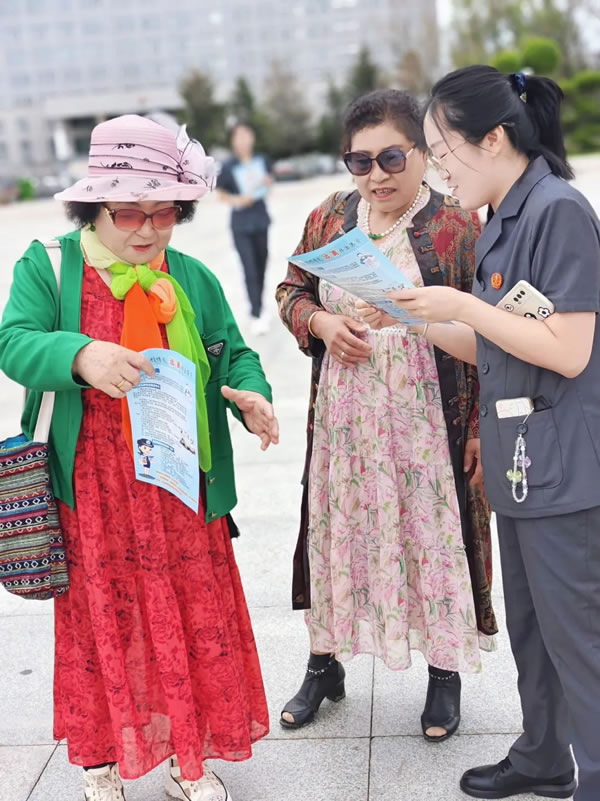 “大娘,請您看一下這個宣傳單,今天我們給大家做一個防范非法集資的普法活動,通俗來講就是教你們怎么不被騙......”