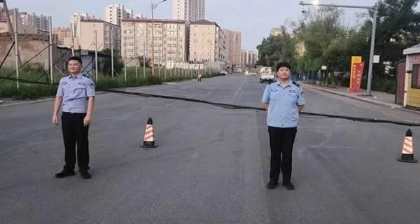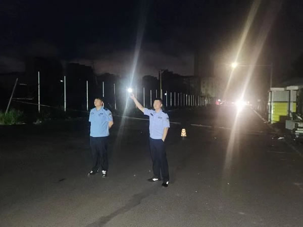 由于該路段照明設施少,電線桿倒伏位置特殊,現場十分危險,為防止車輛看不見電線而發(fā)生交通事故,在維修人員未到達現場之前,兩名民警分工明確,一人在來車方向200米處設置警示標志,用喊話器喊話,引導小型車輛從附近小巷道路繞行,大型車輛則在安全區(qū)域等候;另一人負責維護現場秩序,防止群眾靠近危險區(qū)域,并耐心向受阻群眾解釋情況。