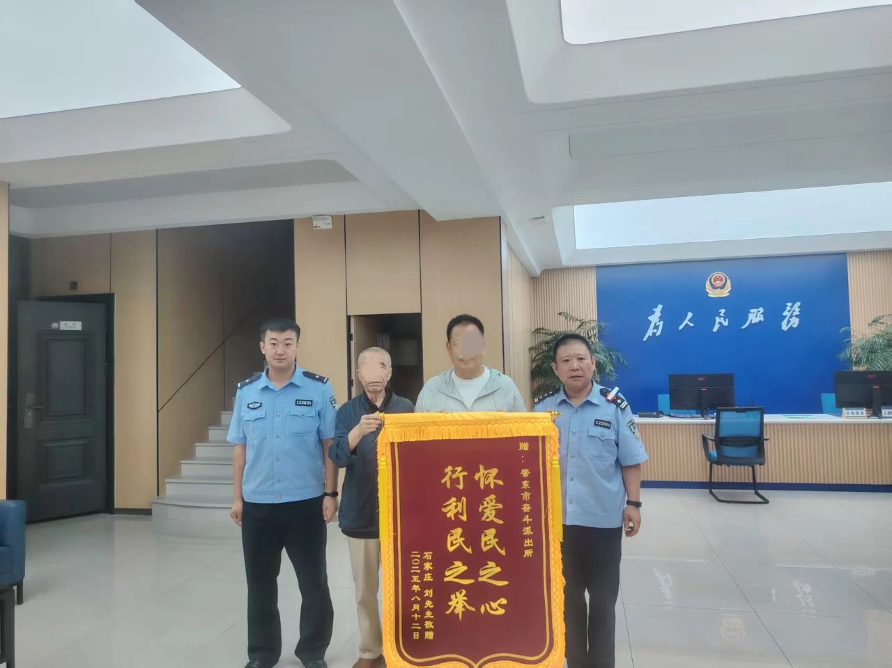 看到許久未見的朋友,劉先生激動(dòng)不已。為感謝民警的熱心幫助,他特意定制了一面寫有“懷愛民之心,行利民之舉”的錦旗送到奮斗派出所,對(duì)李雪松、張藝超兩位民警認(rèn)真負(fù)責(zé)的工作態(tài)度表示由衷感謝。