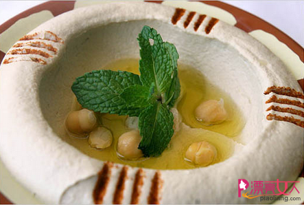 、 鷹嘴豆泡發(fā)加稍蓋過的水,用電飯煲普通米飯鐺做熟。熟鷹嘴豆、植物油約1茶匙、芝麻醬2湯匙、兩個檸檬的汁、鹽少許、豆醬1湯匙放入料理機(jī)內(nèi);加入干歐芹碎1茶匙和適量水,用料理機(jī)中檔打成粗豆泥;