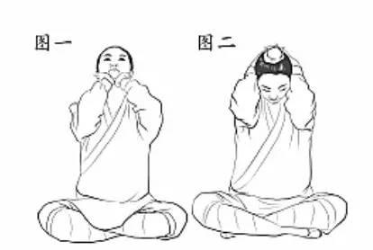 十指交叉抱于腦后,上體左轉(zhuǎn)45度,然后右傾,抻拉左脅肋部,略停兩秒后恢復(fù)上體正直,再左傾抻拉右脅肋部;然后,頭向上充分抬起,兩手在頸下稍稍向上助力,與頸部形成爭(zhēng)力,略停兩秒(如圖1);慢慢低頭,兩掌抱頭下按,略停兩秒(如圖2)。