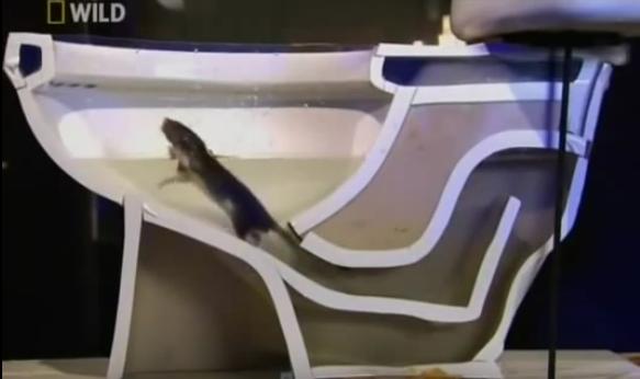 雖然讓人覺得很惡心,但是我們還是一起來看看老鼠如何從下水道進入家里的吧! 視頻中實驗者為了便于觀察,設計了這種半透明的馬桶,好讓各位觀眾能夠看到老鼠的運動軌跡。