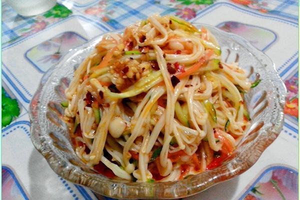 做法:金針菇撕開,凈水洗凈,青椒洗凈切絲,蒜剁成沫。洗凈后的金針菇放入開水中汆燙,撈出,潷出水分;放入切好的青椒絲和蒜末,調(diào)入鹽、糖、芥末油和香油。 拌勻后,上桌前淋上紅油,即可。