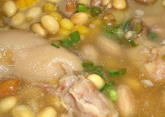 做法:豬腳加入姜片飛水去異味,切成小塊;加入去核切塊的雪梨、大豆和1塊姜,加足水煮到沸騰,開(kāi)蓋繼續(xù)旺火沸煮15分鐘,轉(zhuǎn)慢火煲1小時(shí),喝之前根據(jù)個(gè)人口味加鹽調(diào)味。