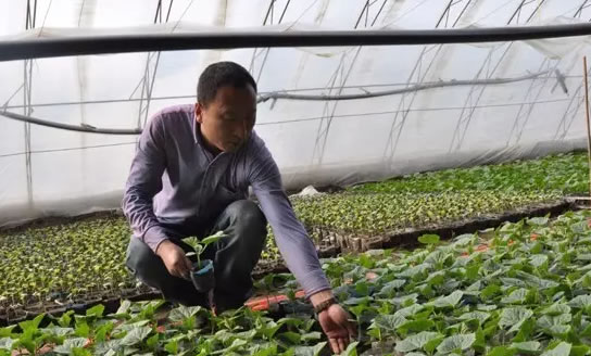 近日,肇東市五站鎮(zhèn)綠園農(nóng)業(yè)生態(tài)種植園技術(shù)員李曉峰在查看用有機質(zhì)育苗,等待移栽的黃瓜秧苗。