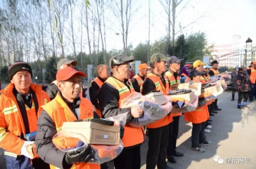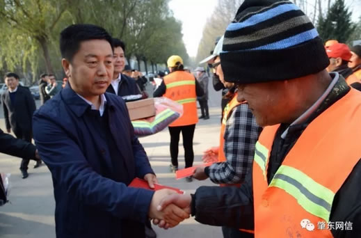 在西園區(qū)辦事處佳和社區(qū)環(huán)衛(wèi)工作現(xiàn)場(chǎng),李延春與環(huán)衛(wèi)工人代表一一握手,并向環(huán)衛(wèi)工人發(fā)放了冬季棉衣、棉帽、手套、棉鞋等冬季保暖用品及慰問金。