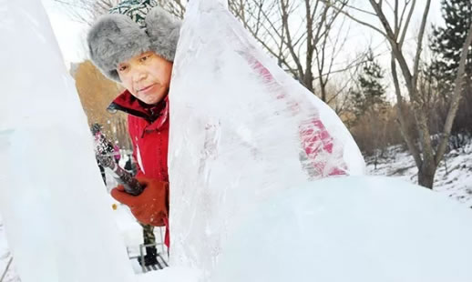 連日來(lái),冰雕師孫河在肇東市人工湖岸邊,用電鋸、雪鏟、錘子等工具“敲鑿磨削”,把喜慶的紅燈籠、美麗的白天鵝、憨態(tài)可掬的屬相狗,雕刻進(jìn)晶瑩剔透的冰塊,打造著“冰雪童話世界”。