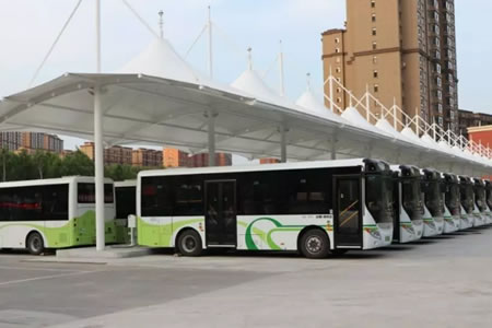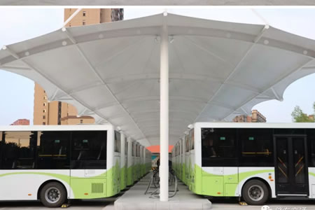 充電站整體建筑,2018年“一期工程”充電棚采用陽光板鋼結(jié)構(gòu),而今年的“二期工程”充電棚建設(shè)采用更加先進(jìn)的張拉膜結(jié)構(gòu),大部分由鋼材、索和膜構(gòu)成,造型美觀,兼具透光、節(jié)能、環(huán)保,優(yōu)良的阻燃性,防污自潔性為一體,最重要的是安全、可靠、壽命長。