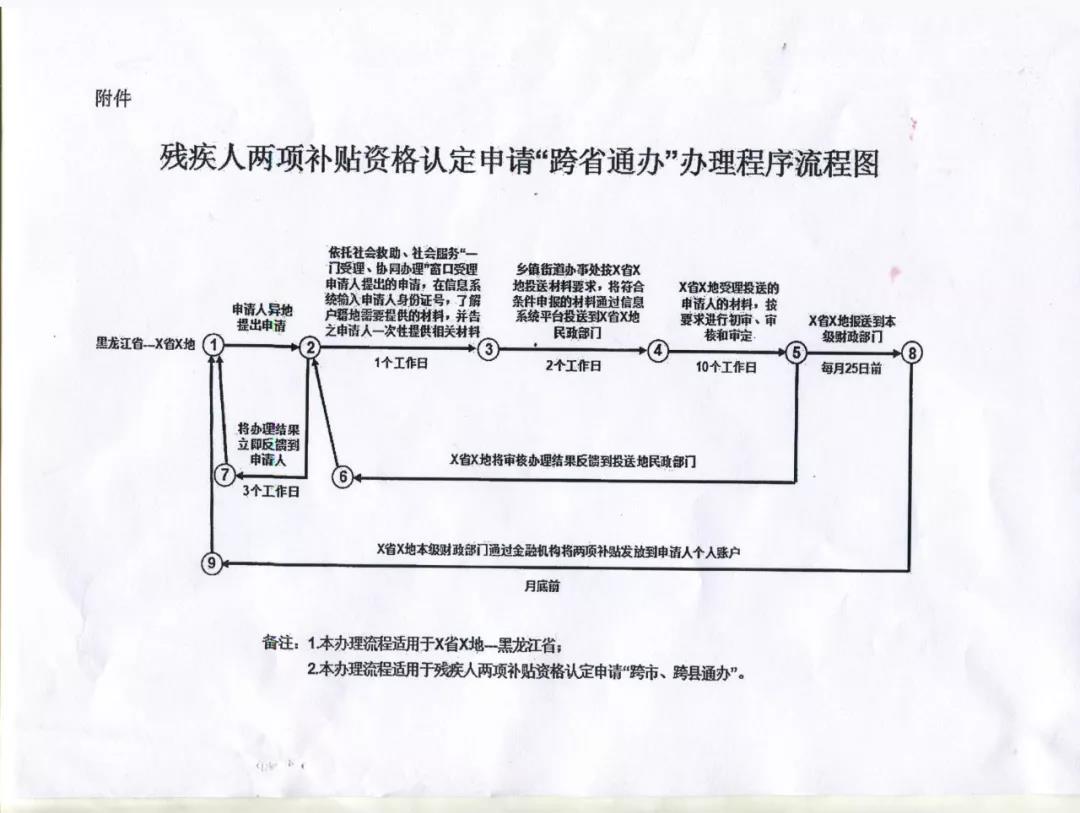 二、規(guī)范補(bǔ)貼資格認(rèn)定申請“跨省通辦”程序各鄉(xiāng)(鎮(zhèn))、街道辦事處要按照異地代收代辦方式,統(tǒng)一使用全國殘疾人兩項(xiàng)補(bǔ)貼信息系統(tǒng)(以下簡稱全國系統(tǒng))受理殘疾人兩項(xiàng)補(bǔ)貼資格認(rèn)定“跨省通辦”申請。受理地要一次性告知申請人所需要提供的材料,及時(shí)將相關(guān)證明材料等申請信息錄入全國系統(tǒng),并在申請材料收齊之日起3個(gè)工作日內(nèi)推送至業(yè)務(wù)屬地(即申請人戶籍所在地)的補(bǔ)貼受理窗口;業(yè)務(wù)屬地為申請人遠(yuǎn)程辦理,自收到推送材料之日起10個(gè)工作日內(nèi)完成補(bǔ)貼資格認(rèn)定,辦理結(jié)果將由全國系統(tǒng)實(shí)時(shí)反饋受理地;受理地應(yīng)在收到辦理結(jié)果3個(gè)工作日內(nèi),將辦理結(jié)果以適當(dāng)方式通知申請人。享受補(bǔ)貼政策的類型及標(biāo)準(zhǔn)由業(yè)務(wù)屬地負(fù)責(zé)解釋。補(bǔ)貼資格審定合格的,自遞交申請當(dāng)月由業(yè)務(wù)屬地計(jì)發(fā)補(bǔ)貼。