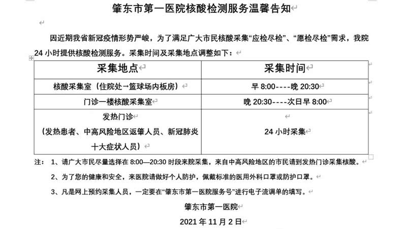 因近期我省新冠疫情形勢嚴(yán)峻,為了滿足廣大市民核酸采集“應(yīng)檢盡檢”、“愿檢盡檢”需求,我院24小時提供核酸檢測服務(wù)。采集時間及采集地點調(diào)整如下: