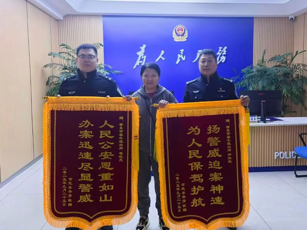 為表達對奮斗派出所民警、輔警的感激之情, 10 月 10 日,李女士特意制作了兩面寫有 “人民公安恩重如山,辦案迅速盡顯警威”“揚警威破案神速,為人民保駕護航” 的錦旗,專程送到奮斗派出所,親手交到民警尹洪波和輔警崔曉亮手中,用最樸實的方式向守護群眾財產(chǎn)安全的人民警察致敬。