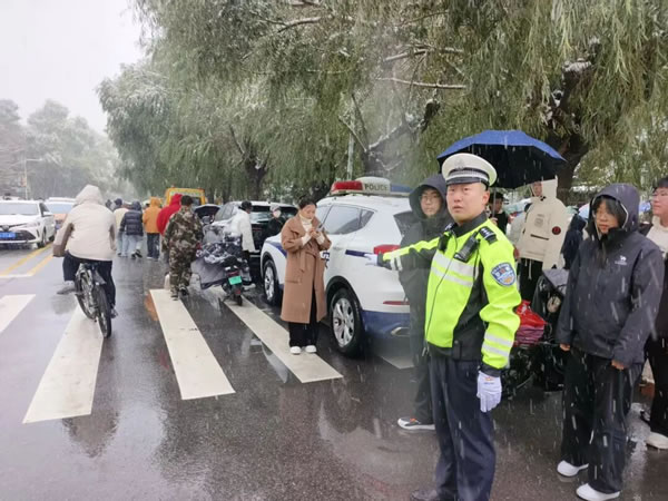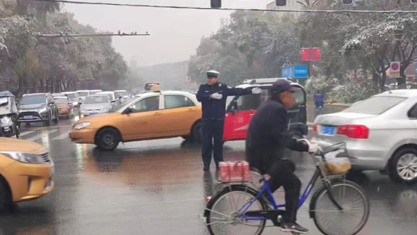 正值上學上班早高峰時段,雪勢愈發(fā)急切。路上的車流量正逐漸增大,一排排車輛披著白皚皚的雪花,司機們開啟行車燈,打開雨刮,小心翼翼地駕駛著車輛。此時,從主干道到居民區(qū)的街巷,身著制服的交警身影早已鋪開,在風雪中織就了一張守護之網(wǎng)。在城區(qū)主要交通樞紐、小區(qū)門口、學校周邊,忙碌的交警隨處可見。雪花落在帽檐上化成水珠,順著臉頰往下淌,他們卻無暇顧及擦拭。他們的指揮手勢始終沉穩(wěn)而有力,每一次抬臂、轉(zhuǎn)向,都仿佛在風雪中劃出了安全的坐標,給過往司機“吃下安全的定心丸”。