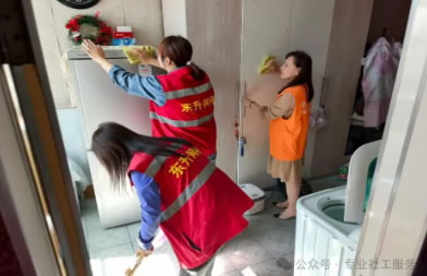 活動(dòng)中,社工站的同志和社區(qū)干部、網(wǎng)格員,明確分工、大家手持抹布、拖把等工具,來(lái)到張大娘的家中,對(duì)老人房間內(nèi)的雜物進(jìn)行分類整理,重點(diǎn)擦拭玻璃、清潔地面、整理物品,確保不留衛(wèi)生死角。經(jīng)過數(shù)小時(shí)的辛勤勞動(dòng),張大娘家中環(huán)境煥然一新,為老人們創(chuàng)造了更加舒適、整潔的居住環(huán)境。