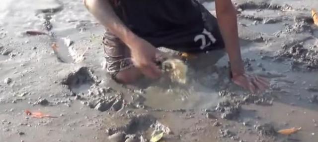 有幾名男孩就在退潮后去海灘上趕海時,在泥潭上發(fā)現(xiàn)兩個洞,一個大的一個小的,現(xiàn)象著實奇特。 為了一探究竟,其中一位男孩把手伸進了大洞里,令人驚奇的是,旁邊的小洞竟冒出了高高的水柱!